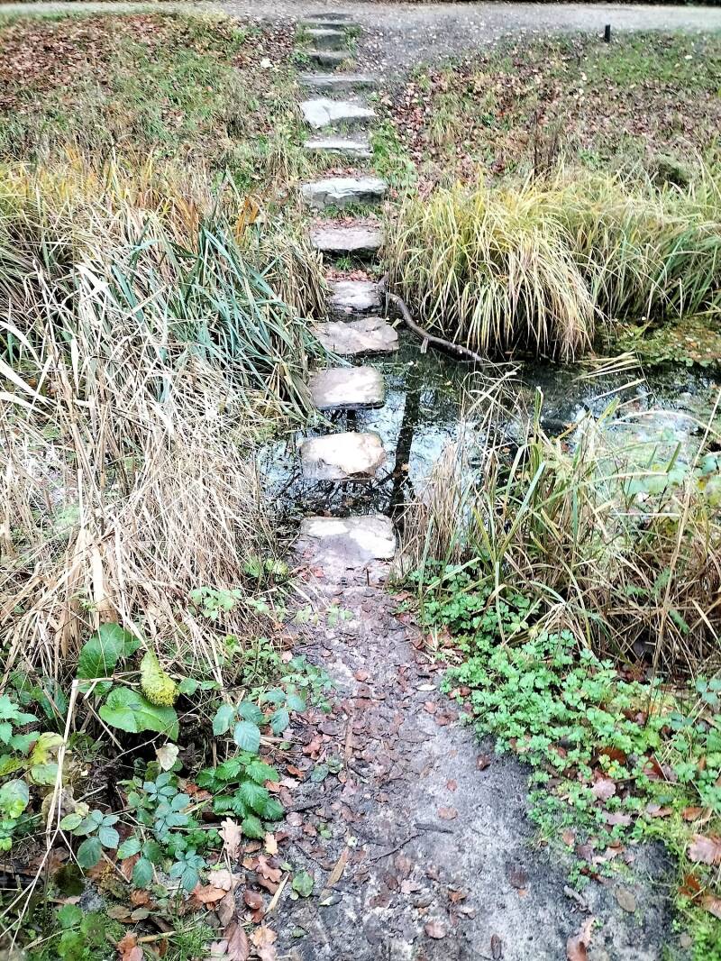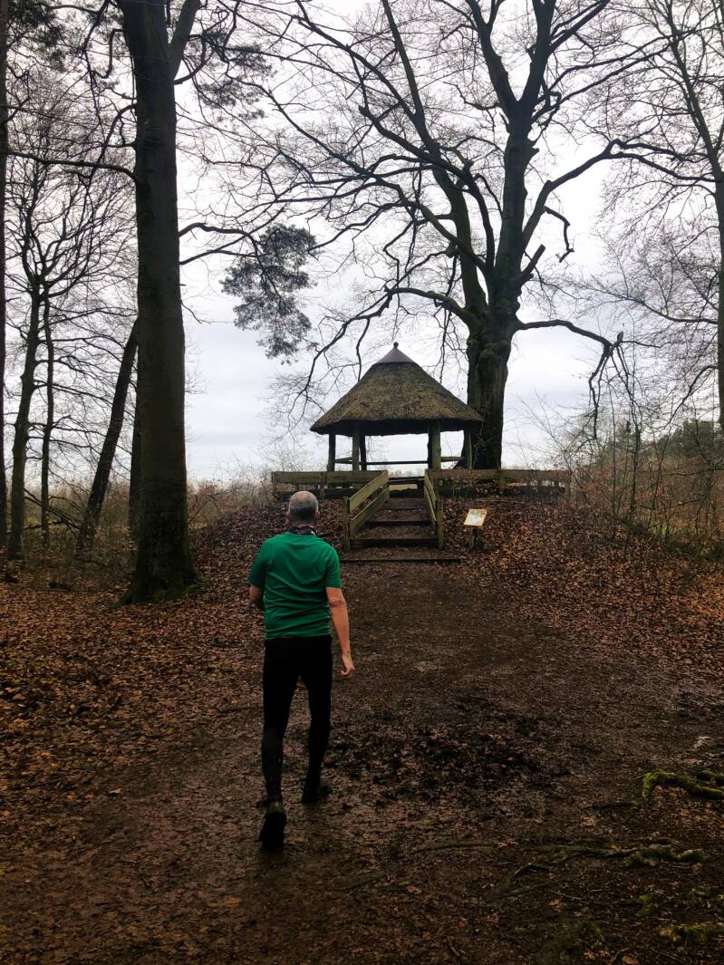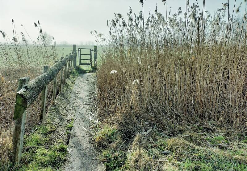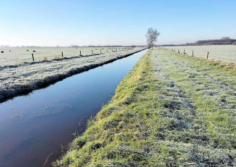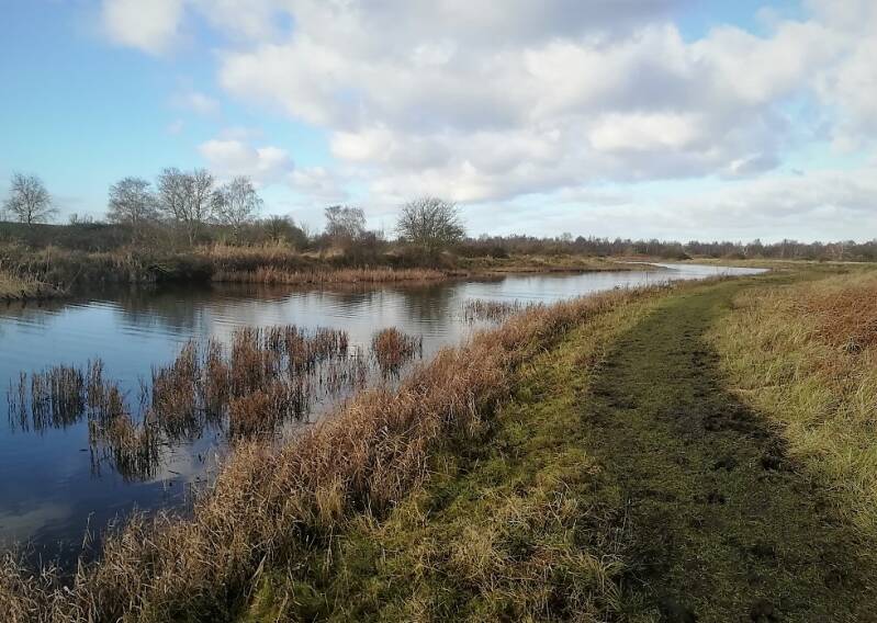 Netjes en uit puur lijfsbehoud bleven we hier op de wandelpaadjes op zoek naar de trap met het uitzichtpunt, een mooi maar nog wat wankel bouwsel. Aangezien het gebied nogal onder handen is genomen levert dat ook weer nieuwe paadjes op, dus wij besloten plots om, dwars door een sloot naar het 'paddenpad' te lopen en dat een stuk te volgen. Een schitterend stukje natuur waar ik alvast mijn Oudejaarsdip beleefde, omdat ik zo nodig nog over een glijplank naar een verscholen paadje wilde - nat tot aan mijn kruis dus - Zeiknat en inmiddels dwars door de natte weilanden vonden we een alternatieve terugweg die we er zeker in houden. Je zult begrijpen dat vanwege mijn positie en de temperatuur we binnen no time de laatste 3 km hebben afgelegd.