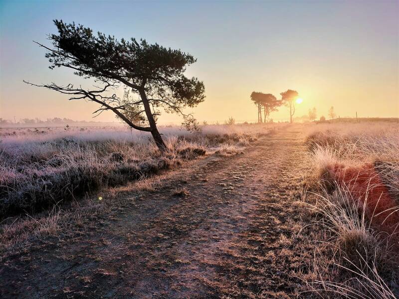 Vandaag dus; weer een mooie ochtend. Op de Woensdrechtse Hei lag de rijp op de begroeiing, hing er nog een verdwaalde bal in een boom en was het, op wat knallen na, erg rustig.