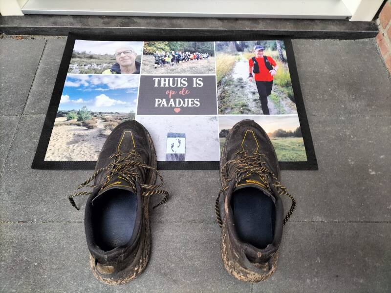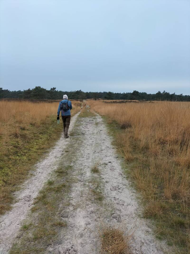 Ik kan een glimlach niet onderdrukken als, na mij, een stelletje in spijkerbroek en op gymschoentjes dezelfde richting op gaat waar ik vandaan kom. "We gaan natuurlijk voor de lange route", hoor ik de een tegen de ander zeggen. "Prima", denk ik en ik loop door. Ik moet nog afscheid nemen van mijn hoge wandelschoenen waarvan de zolen het onderweg begeven hebben. Te lang niet gebruikt en niet meer te repareren weet ik uit ervaring. Voor nu de hak nog even kunnen vastmaken met mijn boterhamzak (geen horeca immers) waaraan ik een mondkapje had vastgeknoopt. Zijn die dingen toch nog ergens goed voor.