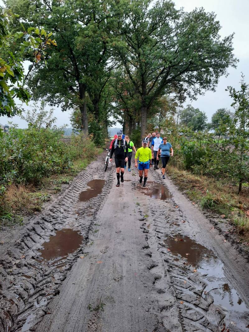 “Wat is’t nat, wat is’t nat, onder mijne voeten …….” Een liedje uit vervlogen tijden waar ik aan moest denken toen op 1 november ruim 20 Thorren en Footprinters de heuveltjes rond Huijbergen gingen aanvallen, met daarbij voor de langere afstand ook nog de zandbak rond vliegbasis Woensdrecht. Daarmee was de matige opkomst van afgelopen weken tevens weggespoeld en kon ik met gerust hart vaststellen dat ‘die hard trailers’ de weersomstandigheden niet schuwen om de paadjes op te gaan.