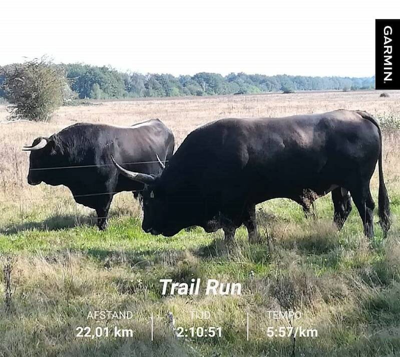 Verder in juli liep ik een aantal verkenningen/loopjes om her en der wat te checken. Soms levert dat verrassingen op. Op 14 juli een trail van 13km vanaf P Noord; heerlijk dat alle paadjes na het broedseizoen weer open waren. Deze dag trof ik (weer) robuuste runderen waar ik respectvol een zijstapje voor maak.