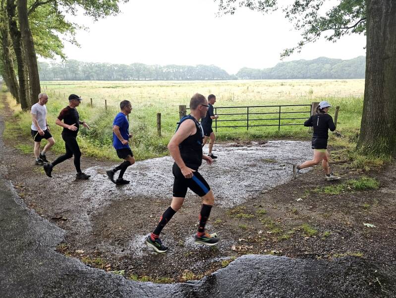 Zaterdag 2 augustus; Footprint en THOR, de Buisse Hei en 28 lopers die bakken met regen negeerden en klaarstonden voor een hike of trail. Het is altijd even afwachten met vakantietijd en minder goed weer, maar niet voor de echte trailliefhebber dus. De koepels op de Buisse Hei, Wallsteijn, de Reten en de Moeren zorgen ieder jaar weer voor een grote groep liefhebbers van deze afwisselende landgoederen. Een groepsfoto proberen te maken onder een afdak valt niet mee, maar hoort er bij en daarna gaan 4 enthousiaste groepjes laverend of plassen stampend op weg voor een route van 8 tot en met 18km. Na afloop is voor een aantal 't Pannehuske de herberg om op te drogen en bij te komen. Een mooie ochtend en de zon komt alweer voorzichtig door.